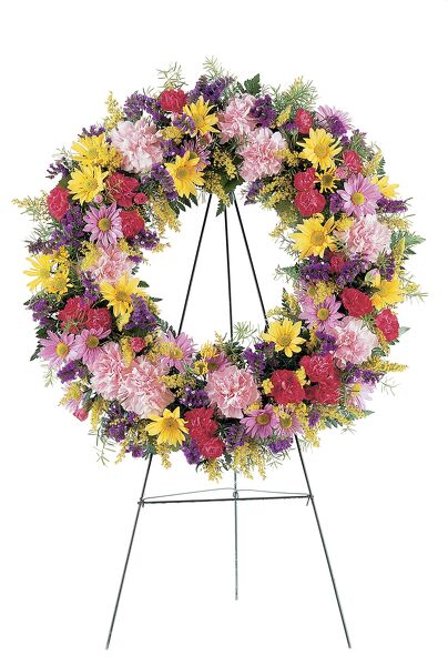 Show your love and support with this beautiful wreath of colorful mixed spring flowers.